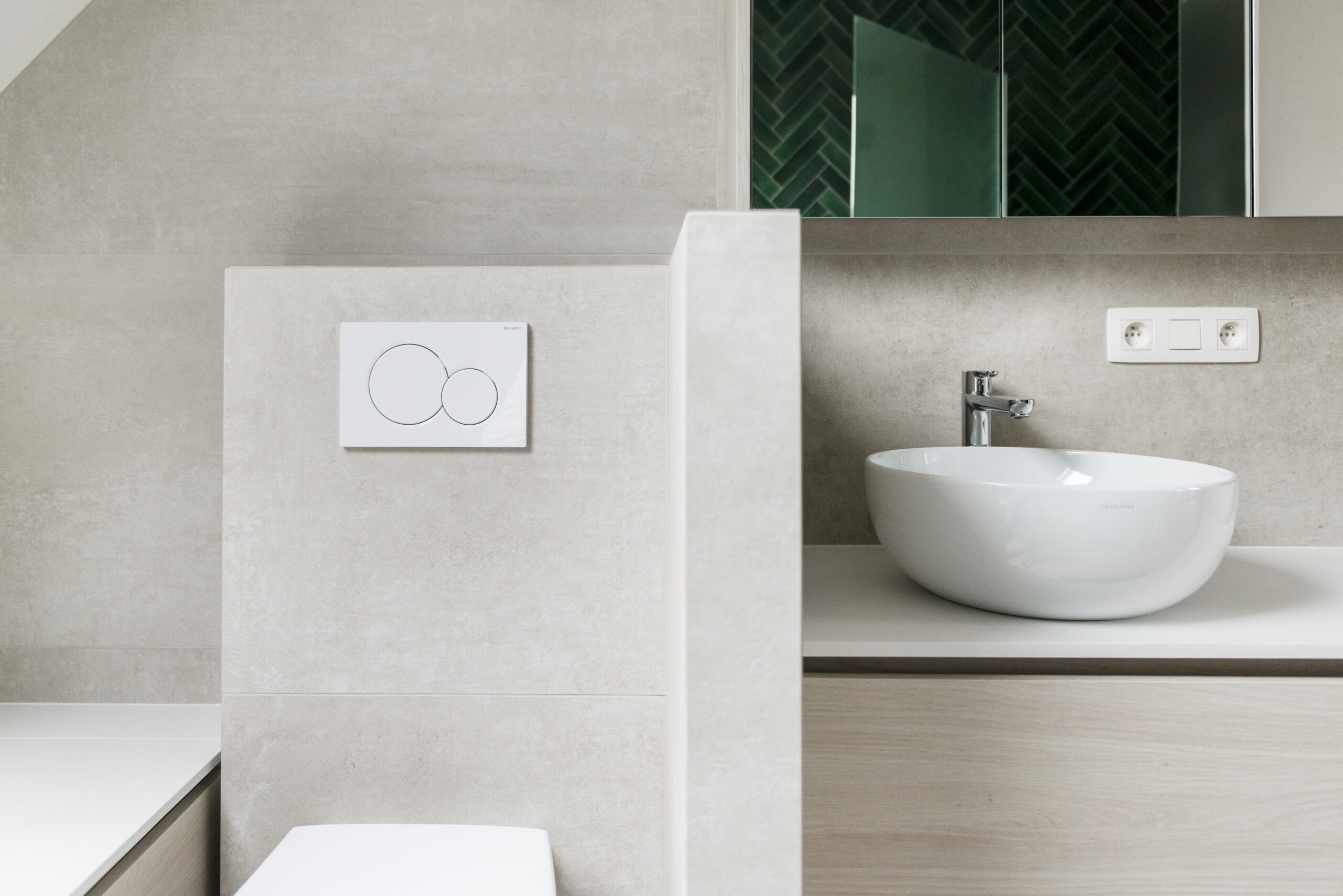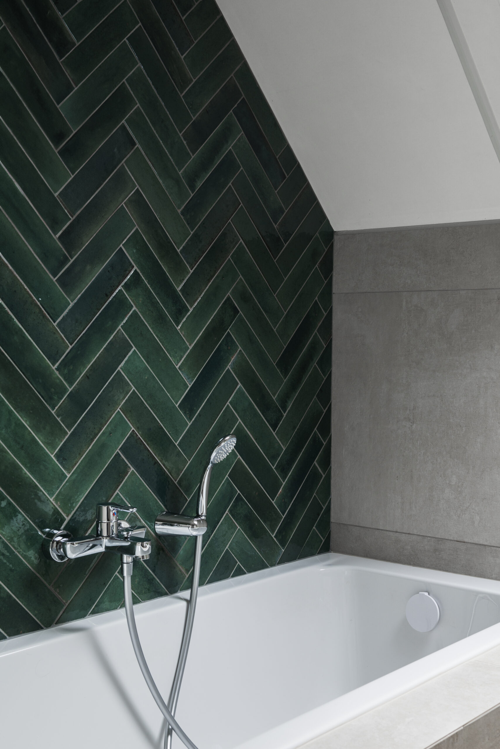 De combinatie van grote tegels met neutrale tinten maakt van dit renovatieproject een uitblinker in onderhoudsvriendelijkheid en ruimtegevoel. Het ontwerp is het resultaat van een uitgekiende indeling waarbij maatwerk essentieel bleek te zijn. Zonder te moeten inboeten op voorzieningen - inloopdouche, ligbad, toilet, opbergruimte én dubbele lavabo zijn aanwezig - blijft deze badkamer een gevoel van ruimte bieden. De verrassende keuze voor een groen geglazuurde betegeling in de douche en tegen de wand van het ligbad geeft deze badkamer een warme, moderne twist. Zowel het ontwerp als de uitwerking van het maatwerk zijn van de hand van STISTRA.